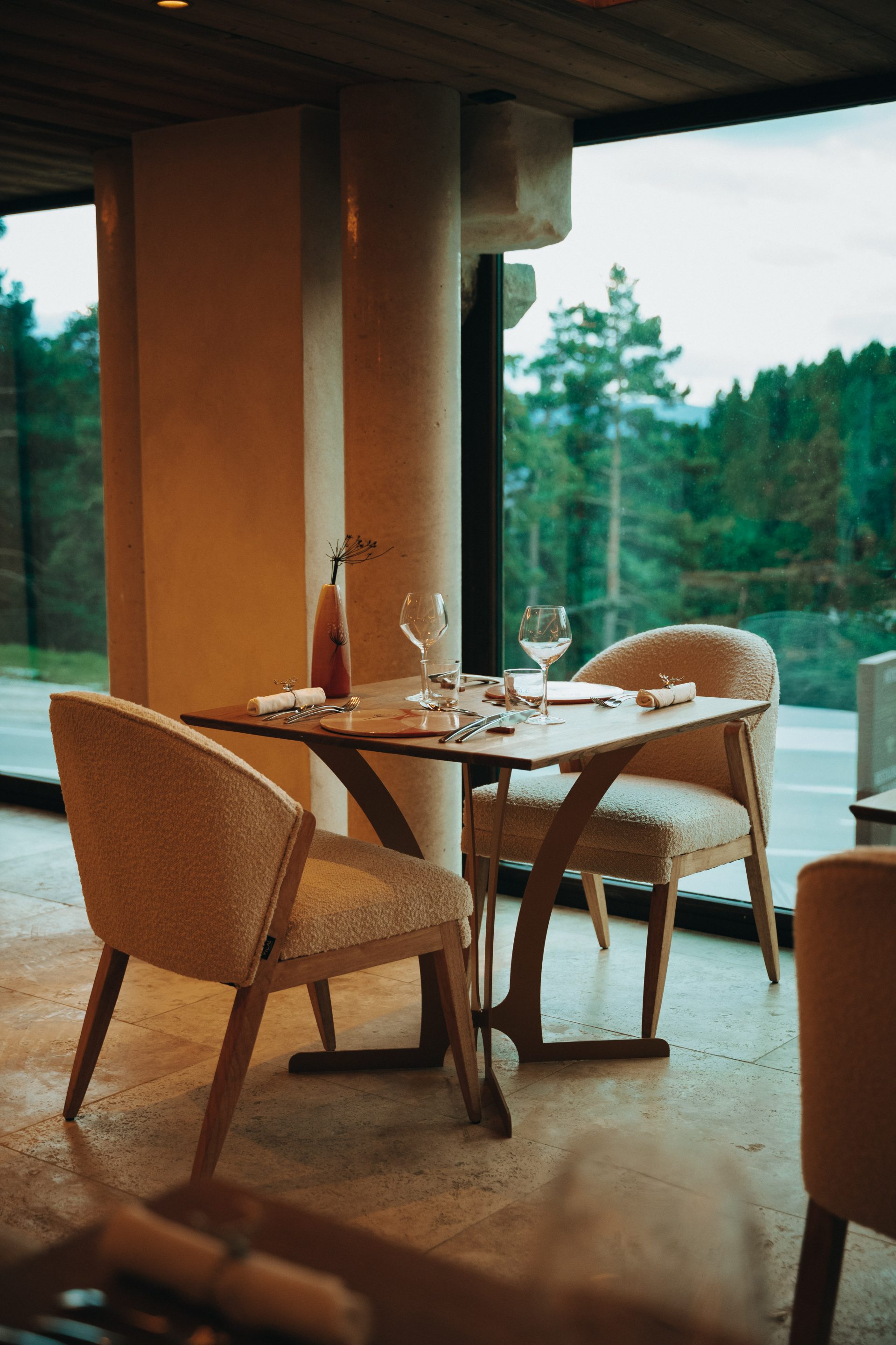 De larges baies vitrées courant du sol au plafond, une cheminée autour de laquelle s’orchestrent tables et chaises, une superbe cave à vins où de jolis flacons dorment à l’abri d’un écrin de verre et de métal, partout du bois, de la pierre, des tons blancs nacrés, des jeux de lumière… C’est dans cet univers offrant une superbe vue sur les Pyrénées et le Cambre d’Aze, que le chef mitonne des petits plats le temps d’un menu unique en cinq services. Pour un dîner au coin du feu, où les meilleurs produits du Roussillon sont mis à l’honneur. Veau « rosée des Pyrénées », Cèpes, truite des Pyrénées et même ollada, jarret et butifara, le plat typique de ces terres. La précision des cuissons, la finesse des textures, quelques pointes d’acidité ou d’amertume…« J’ai voulu un menu aux accents montagnards et catalans, des plats inspirés par la saison,